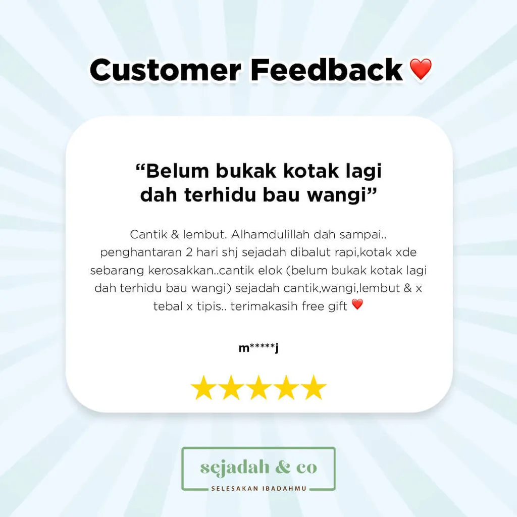 Setiap pembelian anda di SEJADAH.CO akan dijamin dengan kepuasan yang maksimum, kami sentiasa berusaha untuk pastikan anda berpuas-hati disini, insyaAllah.